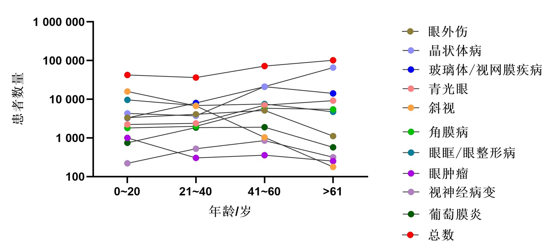 将参与者的年龄、性别、诊疗卡号、临床初步诊断、登记时间、术前四项检测结果等条目信息从实验室信息系统导出到Excel文件中进一步分析。参考既往研究的诊断分类方法[15],以主诊断将眼疾病分为眼外伤、晶状体病、玻璃体/视网膜疾病、青光眼、斜视、角膜病、眼肿瘤、视神经病变、眼眶/眼整形病(眼肿瘤除外)、葡萄膜炎。对于首次就诊为综合门诊的患者,根据患者首次治疗方案定义疾病类型,如首次就诊无相关治疗方案,则选择二次就诊专科类型来判断,以此类推。若患者只有初诊且无法判断疾病类型时,则剔除数据。对于专科门诊患者,根据患者首次就诊的临床诊断作为患者的主要诊断,若首次就诊有多种诊断时,根据首次给予治疗专科进行判断。1.4 统计学分析