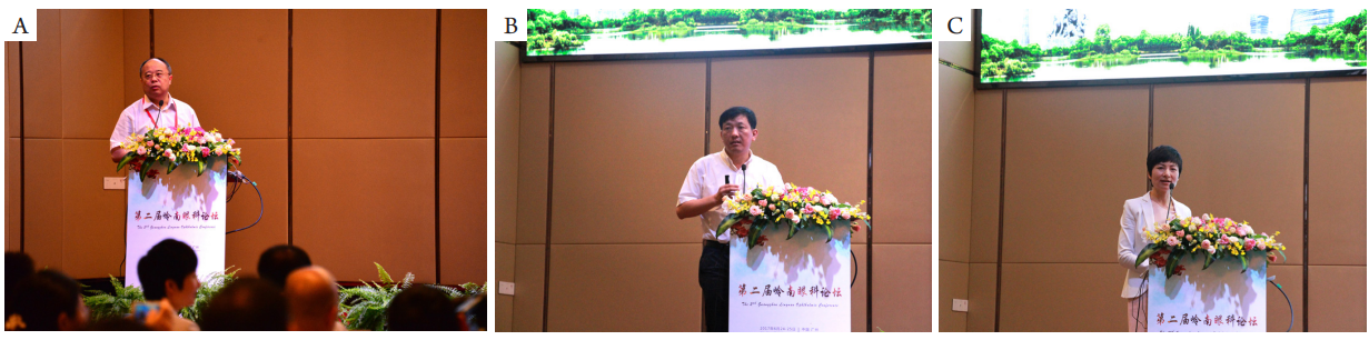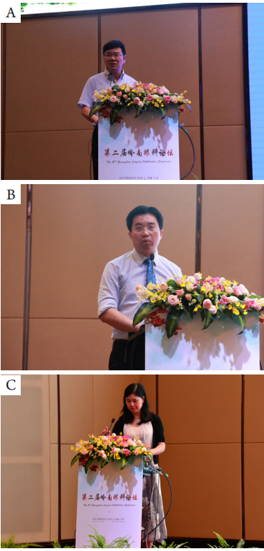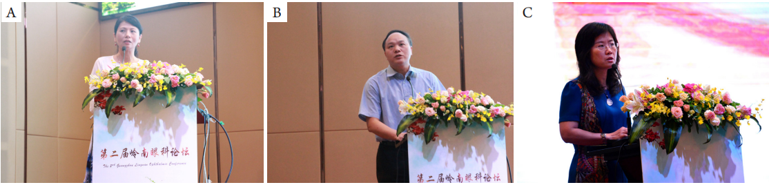 图7 (A)郑丹莹教授、(B)钟兴武教授、(C)柯碧莲教授在大会上作演讲