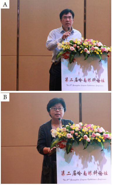 首先是来自山东省眼科医院院长的史伟云教授(图3A)为我们带来的“胬肉手术并发症的分析及处理”的主题演讲。史教授在其演讲中就胬肉切除前需要考虑的手术问题、术中注意事项、术后及术后并发症处理做了详细介绍,并总结了减少并发症的手术要领和技巧,如术前训练患者平躺控制眼球转动方向、术中注意保护泪阜、半月皱襞,及胬肉头部尽可能用钝性分离和剥离方法。来自厦门大学附属厦门眼科中心的刘祖国教授(图3B)在大会上分享了“生物工程角膜的前景与挑战”。刘教授在演讲中谈到,免疫排斥,移植