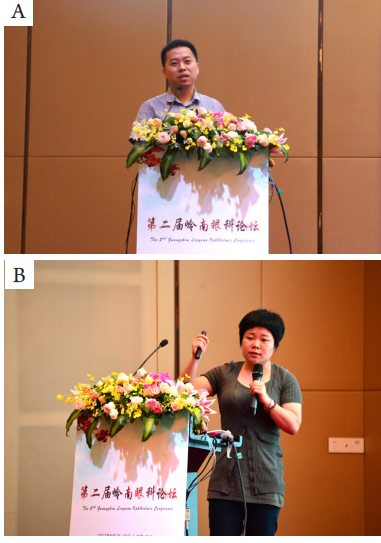 来自汕头国际眼科中心的陈浩宇教授(图9A)在大会上作了“OCT光密度:一个新的诊断参数”为主题的精彩演讲。广州爱尔眼科医院、《眼科学报》中青年编委张静琳教授(图9B),在大会上分享了眼底激光治疗新进展。