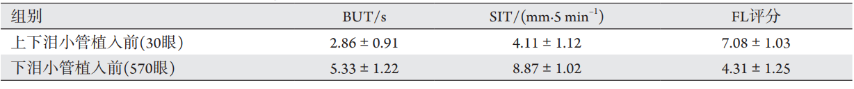 BUT≤4 s,FL≥6分的干眼症患者应植入2个泪道栓子,SIT>7 mm/5 min,BUT>4 s,FL<6 分的干眼