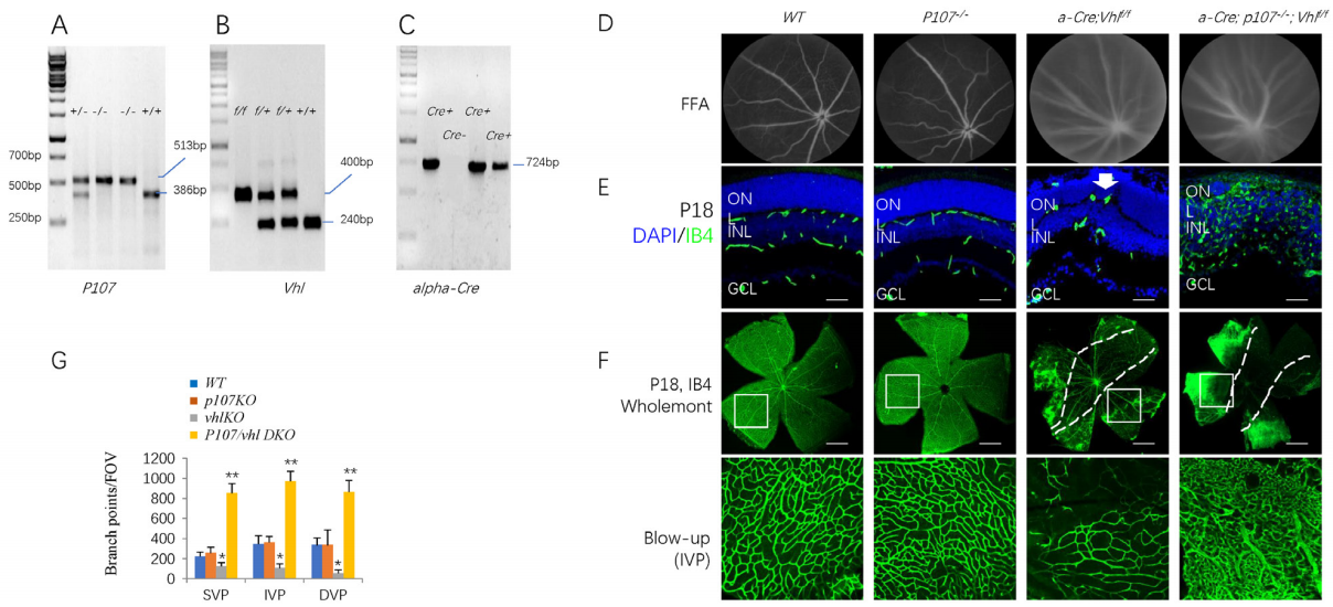 Rb1 and p107 are similar in structure and have functional redundancy and compensation.[24-25] In this study, we utilized genetics, RNA sequencing, chromatin immunoprecipitation (CHIP), and luciferase reporter assays to investigate the role of p107 in this MNV3-like mouse model. Strikingly, p107 deletion in the Vhl -/-retina triggered extensive retinal neovascularization. This phenotype was linked to direct binding and repression of Hif target genes in the retina.