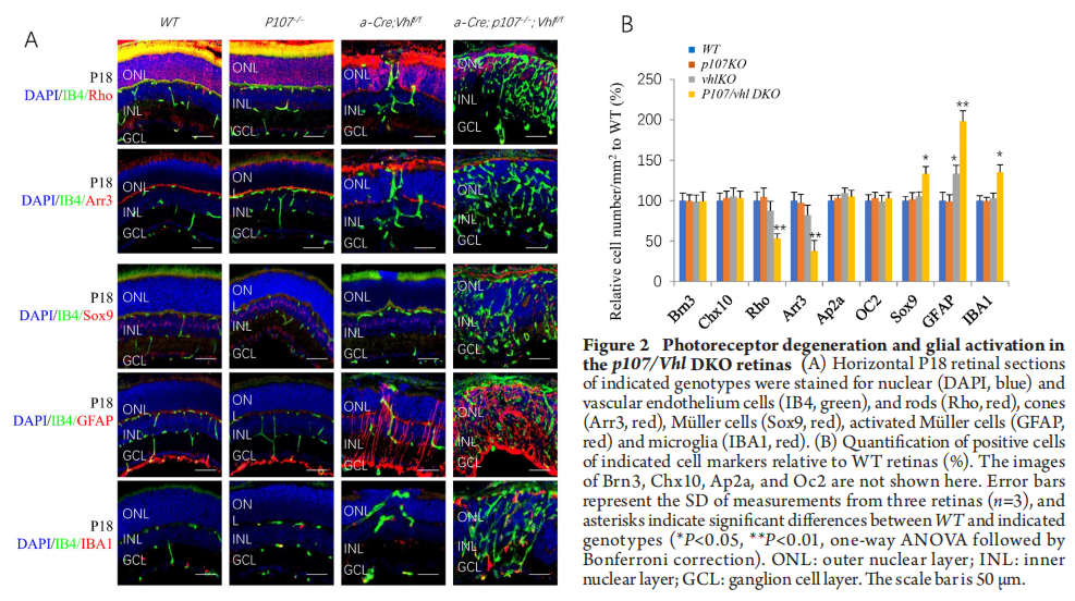 We also looked at the effects of p107 loss on other retinal cells in Vhl null retinas by staining the P18 p107/VhlDKO retina with cell type-specific markers. While we didn’t find any effects on two excitatory neurons including ganglion cells (Brn3+) and bipolar cells (Chx10+), two inhibitory neurons including amacrine cells (Ap2a+) and horizontal cells (Onecut2+or OC2+), p107 loss significantly reduced rod and cones (Figure 2A-B), and increased Sox9+Müller cells and IBA1+ microglia cells in VhlKO retina (Figure 2A-B). GFAP staining indicated that p107 loss activated Müller cells in Vhl null retinas (Figure 2A-B).