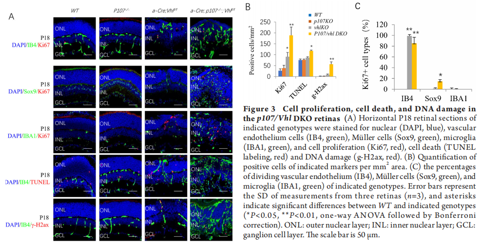 Stained sections and slides were analyzed using a Zeiss Axio Imager Z2 fluorescence microscope and a Nikon C1si confocal microscope. Image J was used for cell counting. The positive cells of TUNEL, Ki67, γ-H2ax, and cell type markers were counted manually. Representative images were analyzed using the AngioTool (NCI) for vascular blood vessel analysis. In brief, at least three ×200 magnification images (320 μm×320 μm fields of view [FOV] per retina) per eye and three eyes from the same genotypes of different litter were counted.