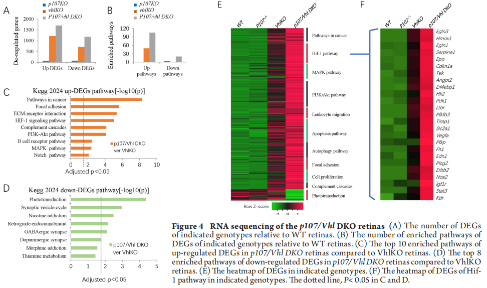 To further understand the vascular and cellular phenotypes in the p107/Vhl DKO, we run RNA sequencing on p14 WT, p107KO, VhlKO, and p107/Vhl DKO retinas. We analyzed differential expression genes (DEGs) and identified 144 p107KO-related DEGs, 1918 VhlKO-related DEGs, and 2874 p107/Vhl DKO-related DEGs compared to WT (Figure 4A). Gene list enrichment found 3, 49, and 125 pathways in p107KO, VhlKO, and p107/Vhl DKO retinas (Figure 4B). For DKO retinas, the most enriched up-regulated DEGs were in the pathways of cancer, focal adhesion, ECM-receptor interaction, Hif-1, PI3K-Akt, and many inflammatory pathways (Figure 4C), the most enriched down-regulated DEGs were in the pathway of phototransduction (Figure 4D). These changes were readily observed by the heatmap (Figure 4E), especially the changes in the Hif-1 pathway presented in the heatmap (Figure 4F). These RNA sequencing data support the notion that p107 constrains the induction of Hif1 targets in the absence of Vhl.