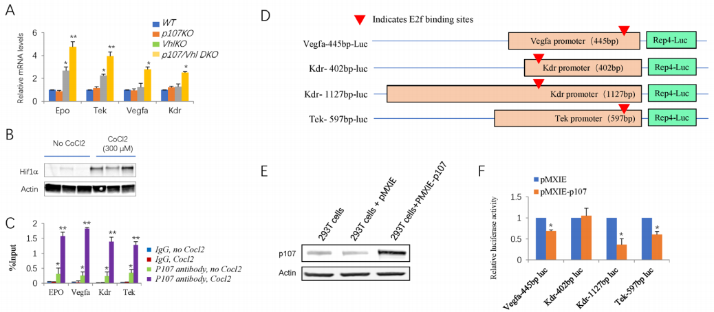 Figure 5 P107 protein can bind the promoter and suppress the transcription of several Hif target genes