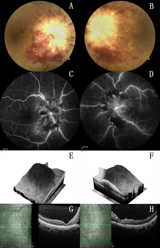 Funduscopy showed a severely swollen optic disc (Frisen grade 5) with no visible optic disc margin and splinter hemorrhages (A: right eye; B: left eye.). FFA showed late disc fluorescence staining, and dilation and staining of retinal vessels of the posterior pole (C: right eye; D: left eye.). OCT showed papilledema (E: right eye; F: left eye.) and RNFL detachment (G: right eye; H: left eye.). Clusters of reflection points with varying degrees of intensity existed in the RNFL of left eye.