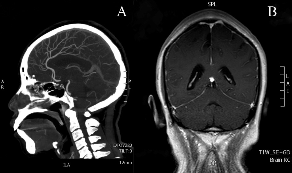 (A): Computed tomography angiography (CTA). (B): Gadolinium-enhanced brain magnetic resonance imaging (MRI). CTA showed no significant abnormalities. MRI revealed diffuse meningeal enhancement.