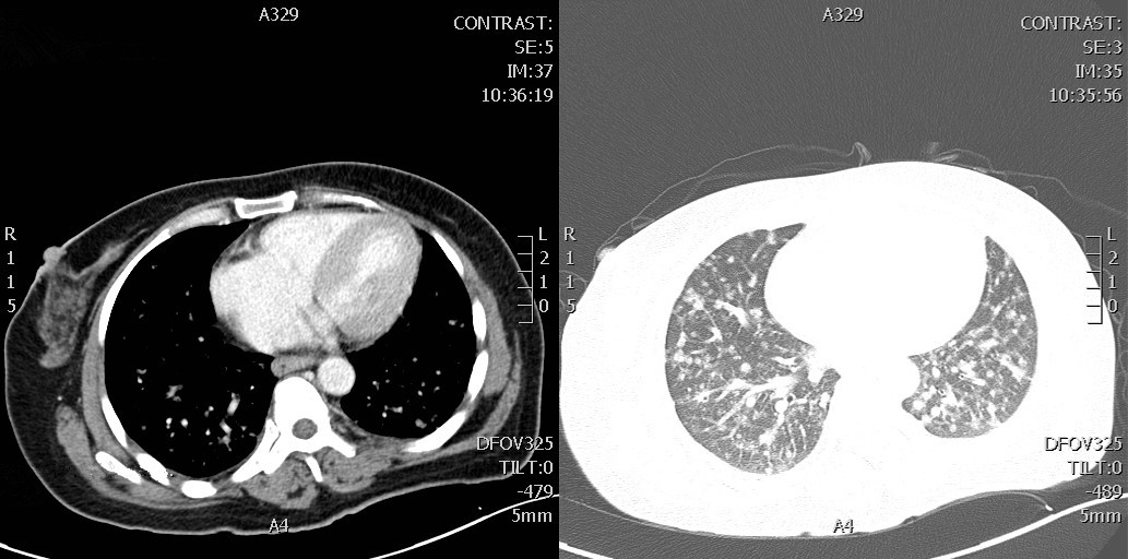 The CT scan detected pulmonary nodules in the apex of the left lung.