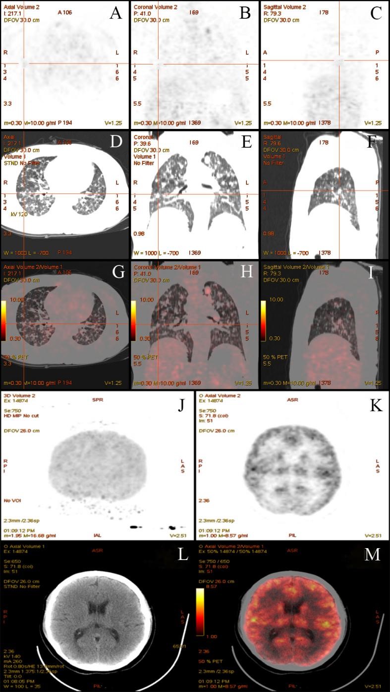The PET-CT prompted the diffuse and varied size malignant lesions of lung (A to I) and revealed nothing remarkable in the meninges, brain parenchyma and brain ventricles ( J to M).