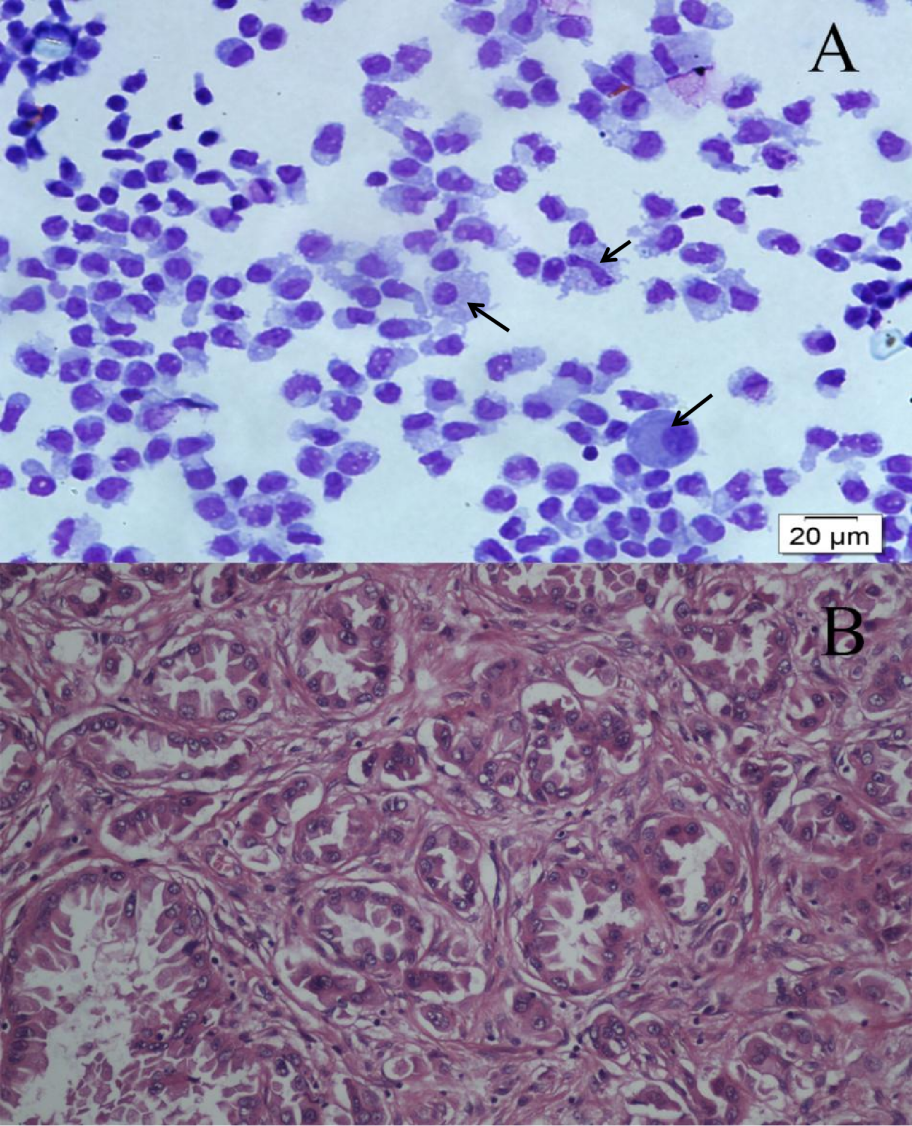 (A): CSF Cytopathology. (B): Biopsy of Lymph Nodes. The CSF cytopathology, using the Wright Staining method, showed the presence of malignant cells with caryoplasm ratio imbalance, double nuclei, and abnormal division (black arrow). Biopsy of the left supraclavicular lymph nodes demonstrated invasive adenocarcinoma cells.