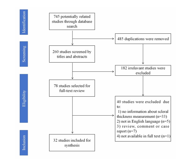 The inclusion criteria were as follows: 1) useof AS-OCT to measure anterior scleral thickness; 2) quantitative measurements of anterior scleral thickness; and 3) full-text available.The exclusion criteria were as follows: 1) involvedanimal subjects or cadaveric eyes; 2) used imagingtechniques other than AS-OCT; 3) no information aboutanterior scleral thickness; 3) case reports, reviews, editorials, or conference abstracts without full text.