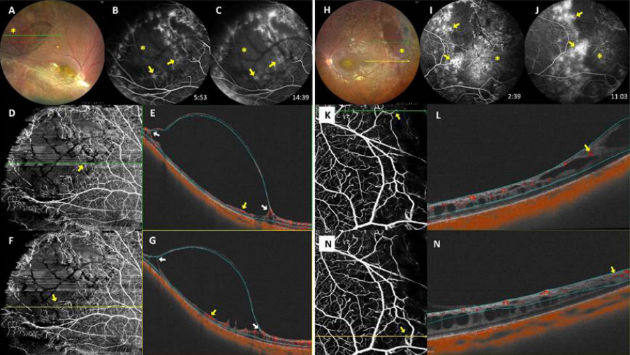 X-linked retinoschisis (XLRS) is an early-onset inherited retinal disorder predominantly affecting males. It is primarily caused by mutations in the RS1 gene and is characterized by intraretinal splitting in the macular and/or periphery.[1] The estimated prevalence ranges from 1:5,000 to 1:25,000.[2] Although the exact pathophysiology of XLRS has not been fully elucidated, initial theories involved Müller cell dysfunction.[3] However, identification of more than 200 different mutations in the retinoschisin (RS1) gene suggests that the pathology rooted in the adhesive protein properties within photoreceptors and bipolar cells.[4-6] Clinically, age of presentation in XLRS ranges from 3 months to school age with features that include strabismus, nystagmus, and decreased vision.[7-8] Complications include vitreous hemorrhage (VH) (reported prevalence; 4 to 40%), retinal detachment (RD) (0-22%) of rhegmatogenous, traction, or exudative origin, retinal vascular abnormalities with or without exudation (6-11%), macular holes, macular folds, and neovascular glaucoma ect.[4,9-12]Advances in retinal imaging contribute significantly to both the diagnosis and understanding of the disease process. Optical coherence topography (OCT) accurately demonstrates the characteristic intraretinal splitting observed in XLRS-affected patients.[3,13]However, fundus fluorescein angiography (FFA), which traditionally reveals normal findings without apparent vascular leakage, has received less emphasis in XLRS diagnosis.[3,14] Interestingly, vascular changes were initially reported using FFA by Green and Jampolin 197915. Previous studies have documented various changes including vascular sheathing, dendritic vascular opacification, aneurysm formation in the schisis cavity, vascular tortuosity, capillary nonperfusion, and retinal neovascularization (RNV), not only within the schisis areas but also in nonschitic retina.[1,11,15-18]