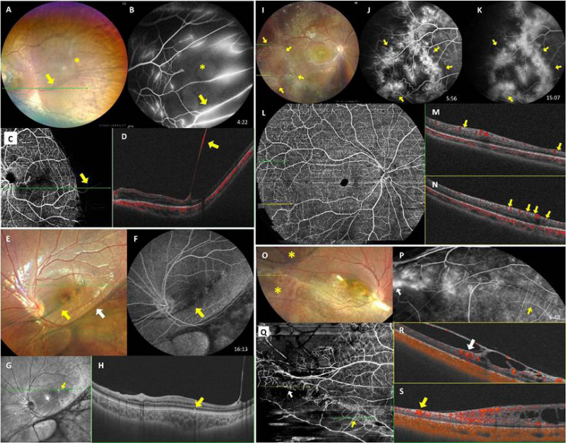 Overall, inter-observer agreement was 0.850 (Cohen’s kappa) .Our study identified six types of FFA changes in patients with XLRS. Dendritic capillary dilation/leakage was present in 42 eyes (91.3%) (Figure 1, A-N) (Figure2, O-R), internal residual vessel leakage in 36 eyes (78.3%) (Figure 2, A-D), and capillary dropout/ischemia in 33 eyes (71.7%) (Figure 1, B-C and I-J) (Figure 2, B). Other findings included zonal RPE proliferation in 3 eyes (6.5%) (Figure 3, F-H) across 3 patients, bridging vessels in 2 eyes(4.4%) (Figure 2, O-Q and S) across 2 patients, capillary sheathing in 2 eyes (4.4%) (Figure 2, I-N) across 1 patient. PPCNV were noted in 5 eyes (10.9%)(Figure 3, A-E) across 3 patients and situs inversus of the optic disc in 6 eyes (13.0%) (Figure 3, F-H) across4 patients. We categorized dendritic capillary dilation/leakage, internal residual vessel leakage, and capillary dropout/ischemia as major vascular changes, and zonal RPE proliferation, bridging vessels, and capillary sheathing as minor changes as well. Among these, marginal dendritic capillary dilation/leakage(Figure 1, A-G), typically observed at the inner border of the peripheral schisis, manifested as dendritiform abnormal capillary dilation and perivascular leakage evident in FFA. The corresponding retinoschisis observed in OCTA involved not only the outer nuclear layer (ONL) or outer retina but also the retinal nerve fiber layer (RNFL).Additionally, dendritic capillary dilation/leakage within the peripheral flat retinoschisis presented FFA leakage traceable back to inner retinal vessels(Figure 1, H-N). The spatial distribution of them across the retina is presented in Supplementary material, Figure 2.