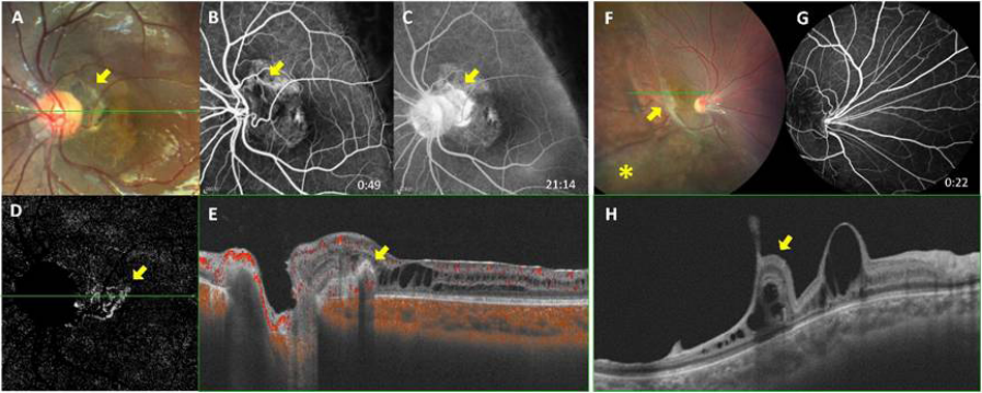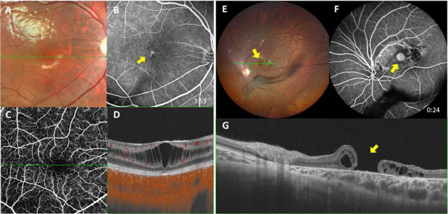 Third, our study identified the presence of PPCNV in 5 eyes (10.9%) of 3 patients (11.5%). This prevalence aligns with our previous findings in a larger cohort indicating that choroidal neovascularization (CNV) is a relatively common but often overlooked complication in XLRS.[26] In our previous study, all CNVs were active and of type 2 (corresponding to the classic CNV identified in FFA). Additionally, PPCNV was identified as the most common location for CNV. Extensive PPCNV, particularly those involving the macula, can lead to severe vision loss and complications such as scar contraction, hemorrhage, or aggressive fibrovascular vessel growth. These findings underscore the importance of timely intervention for vision preservation.Forth, our investigation did not reveal any instances of RNV. Conducting a thorough assessment for angiogenic indicators, such as RNV in eyes with XLRS, is crucial to determine if chronic retinal ischemia is a contributing factor. Understanding whether RNV is a component in the disease progression and potentially the underlying cause of VH in XLRS is of significant interest.