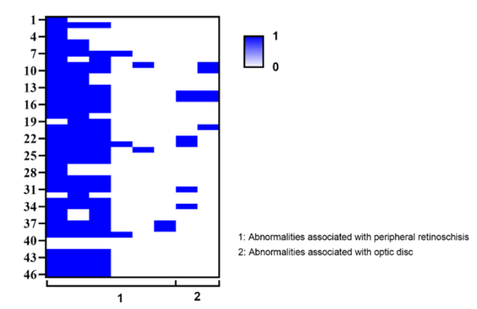 Second, our study represents the first documented instance of situs inversus of the optic disc and zonal RPE proliferation. Situs inversus was identified in 6 eyes (13.0%) across 4 patients (15.4%). This condition is characterized by an atypical emergence of XLRS initially directed nasally, followed by an abrupt turn towards the temporal side, associated with dysversion of the optic nerve head.[22-23] Situs inversus of the optic disc is generally considered a congenital anomaly and is also noted in tilted disc syndrome.[24] In comparison, a previous study reported situs inversus in only 0.21% of 4324 Korean subjects at a glaucoma clinic and in 0.5% of 862 pairs of healthy twins from the UK Adult Twin Registry.[25] Additionally, zonal RPEproliferation was observed in 3 eyes (6.5%) belonging to 3 patients (11.5%). Interestingly, this proliferation occurred precisely parallel to the margins of extensively opened schisis cavities, which exhibited significant traction. Notably, 2 of these cases were in relatively older boys, aged 15 and 24 years respectively. This observation suggests that zonal RPE proliferation may be a response to chronic inflammation and subsequent proliferation, potentially arising from ongoing but subtle traction forces. Unfortunately, we were unable to meaningfully calculate association for situs inversus, as well as zonal RPE proliferation with XLRS because the number of subjects with these phenotypes was too low.Further observations in larger samples could provide valuable insights into the pathogenesis of XLRS.
