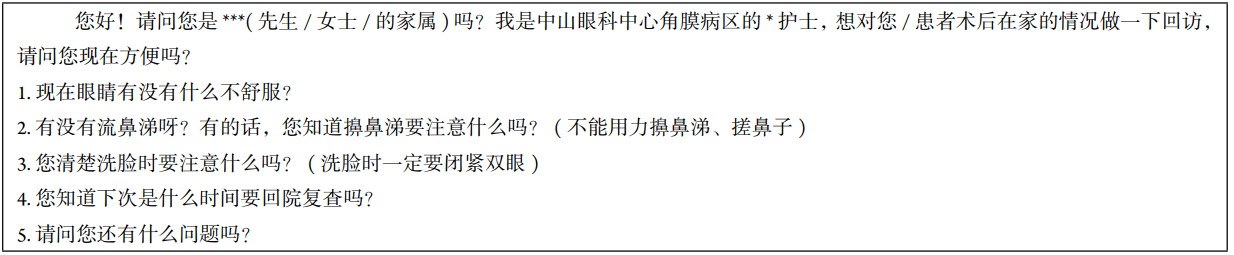 术后1周,责任护士对所管的泪道日间手术患者进行电话回访,按照泪道日间手术患者回访标准语言(图1)进行沟通指导并记录。对未按照复查