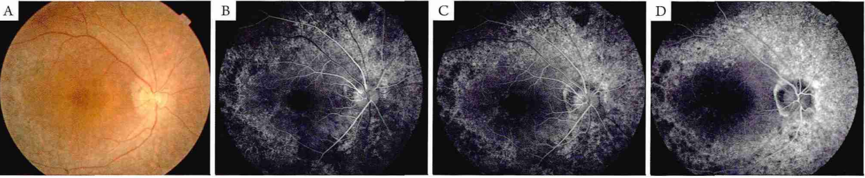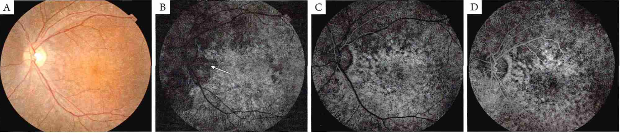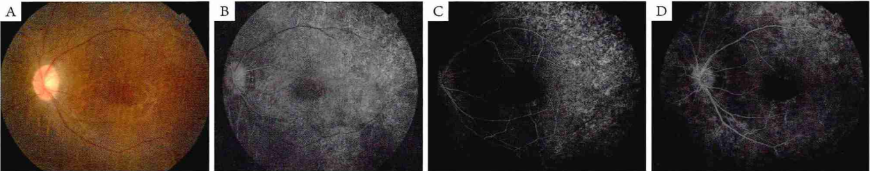 (A)病变前期眼底彩色照相:视网膜颜色较灰暗、视盘颜色基本正常、未见异常色素沉着;(B)患者眼底荧光血管造影动脉期11.3'':视网膜及脉络膜血管充盈正常;(C)患者眼底荧光血管造影静脉期31.2'':眼底呈斑驳状强荧光;(D)患者眼底荧光血管造影晚期2'23'':部分区域荧光素渗漏呈强荧光。