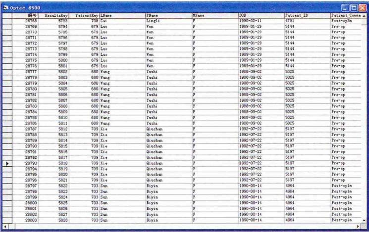 存在两个Excel文件中,其中PatientDb.xls保存了病人的基本信息,ResultsDb.xls保存详细的检查数据,包括检查时间、检查者、检查时的模拟光