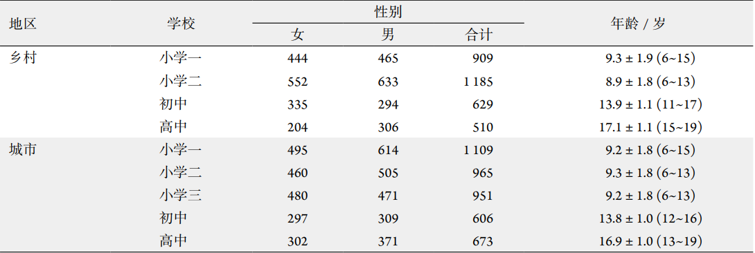 表1 汕头地区9所学校参与调查的男、女学生人数及年龄情况