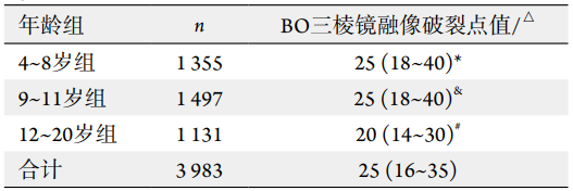 值比较,结果显示三组间的分布差异有统计学意义(P<0.05);进一步两两比较发现4~8岁组及9~11岁组的BI三棱镜平均融像破裂点均高于12~20岁组,差异有统计学意义(P<0.05,表2)。剔除少部分检查结果缺失值后,共纳入3 983名(99.28%)对象,分析年龄组间的BO三棱镜融像破裂点值,差异有统计学意义(P<0.05);两两比较发现4~8岁组及9~11岁组的BO三棱镜融像破裂点均高于12~20岁组,差异有统计学意义(P<0.05,表3)。