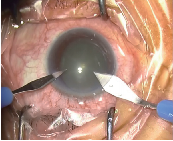 Figure 1 Showing 2.8-mm self-healing incision was made at 11 o’clock and paracentesis at 2 o’clock.