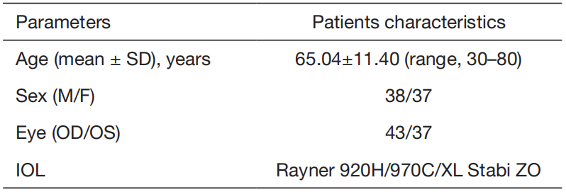 Eighty eyes of 75 patients with cataract were investigated.The sample comprised 38 males and 37 females with a mean age of 65.04±11.40 years (range, 30–80 years). All the patients underwent phacoemulsification and implantation of an acrylic aspheric intraocular lens (IOL) at Joint Shantou International Eye Center, Shantou University and the Chinese University of Hong Kong. The same surgeon (Mingzhi Zhang) performed all surgeries from July 2009 to March 2010. All patients provided informed consent. This