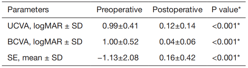 UCVA, uncorrected visual acuity; BCVA, best corrected visual acuity; SE, spherical equivalent; logMAR, logarithm of minimum angle of resolution. *, statistically significant (paired-sampled t-test).