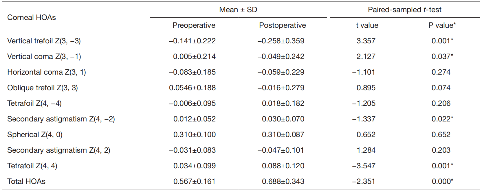 Table 3 Changes in corneal HOAs preoperative and postoperative one month
