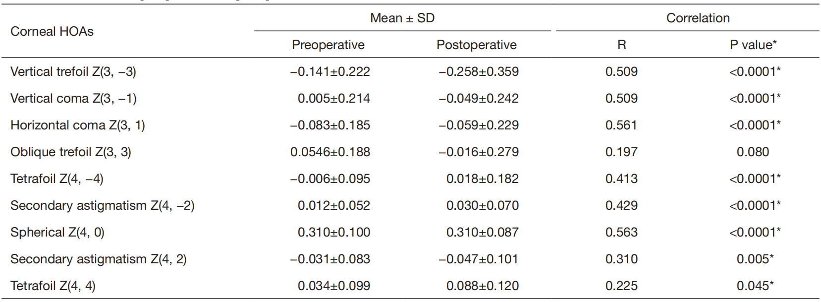 Table 4 Correlation of preoperative and postoperative corneal HOAs