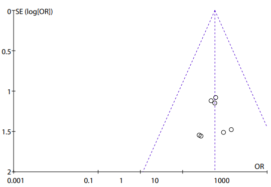 The seven studies all showed a difference between the treatment and control groups in the occurrence of retinal hemorrhaging during vitrectomy in PDR patients. Figure 1 shows the ORs and 95% CIs of each study. The examination of the heterogeneity among all studies did not show statistically significant differences (12=0%, P=0.98). The fixed effects model was used for data combination. After data combination, the OR was 56.93 (95% CI: 21.81- 148.57, P<0.01). The difference was statistically significant. Figure 2 shows the absence of significant publication bias.