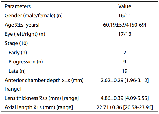 A total of 27 patients (30 eyes) with PCACG, who were treated at the Department of Glaucoma, The Joint Shantou International Eye Center (JSIEC) of Shantou University and the Chinese University of Hong Kong from February 2012 to May 2014, were included in this study [11 females and 16 males, aged 50-69 (60.19±5.94)]. Thirteen right eyes and 17 left eyes were affected. All operations (minimally invasive trabeculectomy) were performed by the same physician, and patients less than 60 years also received mitomycin C during the operation.
