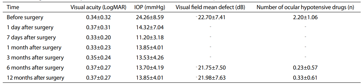 No significant decrease in visual acuity was observed at days 1 and 7 and at months 1, 3, 6, and 12 after operation (P>0.05); however, a significant decrease in IOP was observed at days 1 and 7 and at months 1, 3, 6, and 12 after operation (P<0.01). Moreover, no significant progression in visual field mean defect was observed at months 6 and 12 after operation (P>0.05) (Table 2).