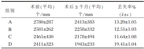 little晶状体核硬度分级标准分为软核和硬核,手术方式为白内障非超声乳化手术,术后第3天用角膜内皮镜检查并记录角膜内皮细胞数量和形态。术后随访3个月,比较并观察4组患者术前和术后角膜内皮细胞丢失率、形态变化和视力恢复情况。