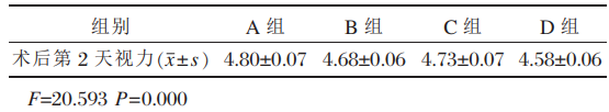 用SPSS16.0统计学软件,按P=0.05水准,随机设计单因素方差分析结果显示:小切口非超声乳化白内障术后第2天,A、B、C、D四组之间视力有显著差异 (F=20.593,P=0.000),进一步行两组之间多重比较结果表明,A组与B和C组之间(P=0.03),A组与D组之间(P=0.00),B组和 C组与D组之间(P=0.14)视力有显著差异,而B组与C组之间(P= 0.49)差异未达到显著水平。结果表明硬核直接娩出组对术后第2天视力影响最大,而软核半娩出组对术后第2天视力影响最小。