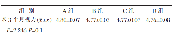 用 SPSS16.0统计学软,按P=0.05水准,随机设计单因素方差分析结果显示:小切口非超声乳化白内障术后3个月,A、B、C、D四组之间视力差异未达到显著水平(F=2.246, P=0.1),进一步行两组之间多重比较结果表明,A、B、C、D四组之间差异无统计学意义(P=0.067)。结果表明4种娩核方式对手术3个月后视力影响无明显差别。