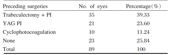 neodymium: YAG laser (YAG) peripheral iridotomy (PI) and 5 eyes had undergone trabeculectomy