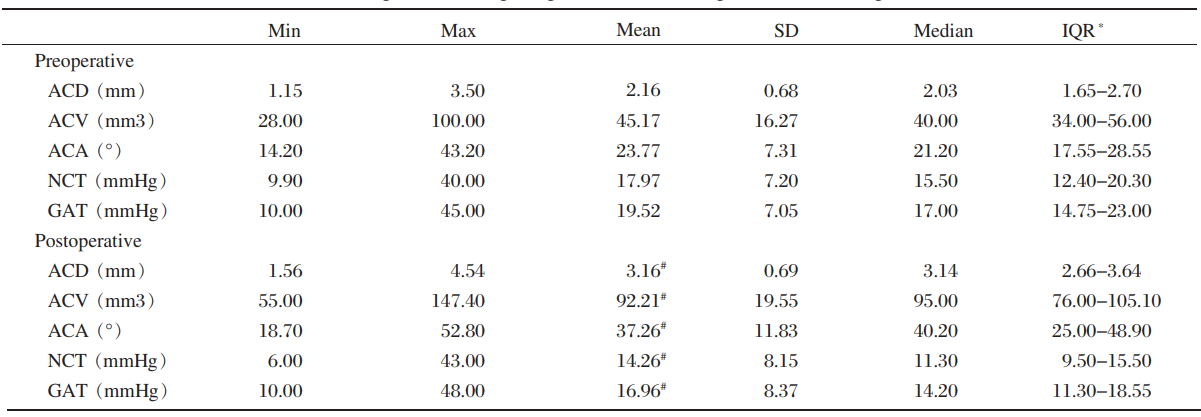 ACD, ACV and ACA were increased significantly (all P<0.001), whereas postoperative IOP was decreased significantly. (P<