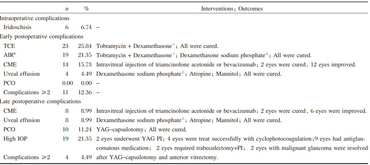 CME (8 eyes, 8.99%), uveal effusion (8 eyes, 8.99%), malignant glaucoma (2 eyes, 2.25%) and posterior capsular
