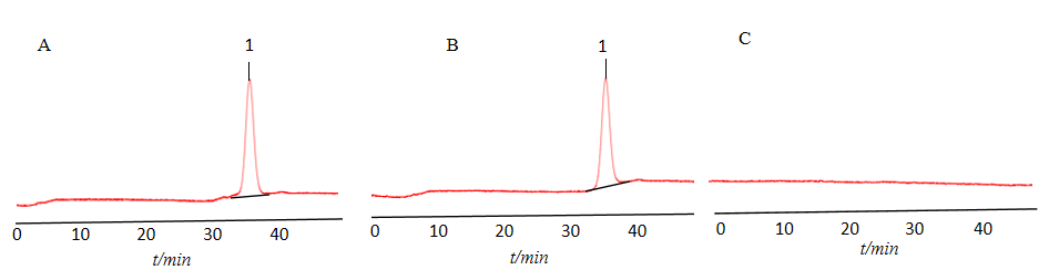 结果显示:供试品溶液主峰与曲伏前列素对照品溶液中主峰保留时间一致,均为37.3 min。阴性供试品溶液不干扰曲伏前列素含量的测定(图1)。结果如图1所示。