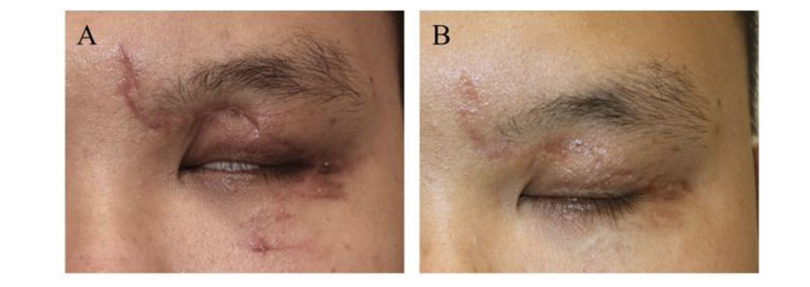 (A) Eyelid scars before laser treatment; (B) Significant improvement in scar height, pigmentation, and eyelid closure after treatment.