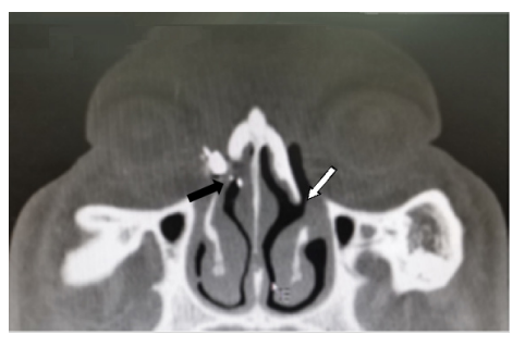 Conventional En-DCR of right eye:Extensive bone removal near medial wall of the lacrimal sac and the ostium was blocked with mucosa thickened. The small sac was filled with high-density contrast.(black arrow)En-LP-DCR of left eye: the ostium located in middle and lower with 1/4 sac with the bone and mucosa near medial wall of the sac preserved mostly.(white arrow).