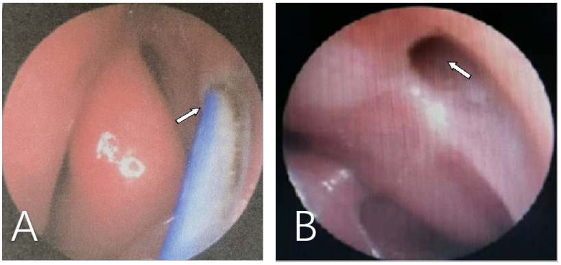(A) The perfact ostium and the stent In situ was seen in patient underwent En-LP-DCR combined with new split RT silicone stent intubation three months later (arrow). (B) A successful case with En-LP-DCR combined with new split RT silicone stent intubation 3 months after operation with stent removel.The perfact lower ostium close to the position and size of the physiological inferior orifice of duct (arrow).