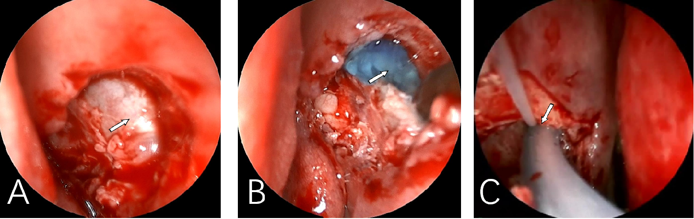 本研究经解放军总医院第三医学中心伦理审查委员会批准批件号:KY2024-032,遵循《赫尔辛基宣言》的原则,82例受试者签署知情同意书,自愿参加本研究。采用前瞻性随机分组对照研究,将2018年12月—2020年12月就诊于解放军总医院眼科医学部的原发性鼻泪管阻塞继发的慢性泪囊炎患者,符合入选标准者,随机分为研究组和对照组。纳入标准:1)鼻泪管阻塞伴慢性泪囊炎的成年患者,鼻泪管阻塞位于泪囊鼻泪管交界处;2)CT泪道造影的泪囊的左右径和前后径均大于5 mm,垂直径大于8 mm;3)泪囊前泪道阻塞段长度不超过1 mm;4患者精神正常。排除标准:1)泪囊和鼻泪管恶性肿瘤;2)外伤性泪囊炎、鼻泪管骨折;3)急性泪囊炎或慢性泪囊炎急性发作;4)严重鼻中隔偏曲鼻腔重度狭窄、重度萎缩性鼻炎者;5)无法耐受手术者。1.2 手术方法