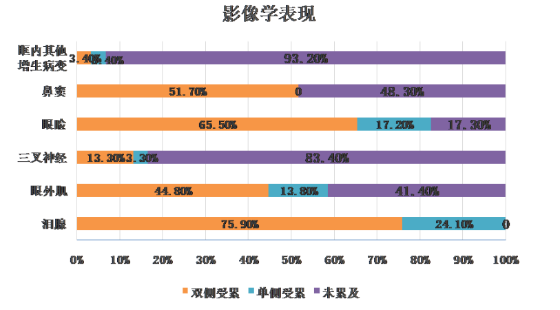 眼眶影像学特征性表现:本组29例患者眼眶CT中,泪腺均受累(100%,22例双侧泪腺均受累,7例单侧泪腺受累),17例(58.62%)患者眼外肌受累,5例(17.24%)患者三叉神经分支受累(4例眶下神经受累,3例额神经受累,2例眶下神经与额神经同时受累), 24例(82.76%)患者眼睑组织受累(19例双侧眼睑同时受累,5例单侧眼睑受累),15例(51.72%)患者鼻黏膜受累,出现类炎症反应,2例(6.90%)患者合并眶内其他增生性病变。见图3。