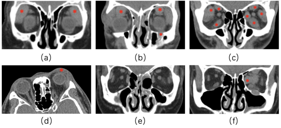 Notes: Patients with trigeminal nerve branch involvement are often accompanied by higher serum IgG4 levels and more cases such as submandibular glands, anterior auricular and cervical lymph nodes with obvious involvement of other organs, so the score of each trigeminal nerve branch involvement is 2 points; The extraocular muscles were observed at the interface of the anterior ethmoid foramen in the coronal position of orbital CT.