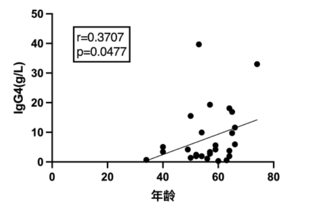本研究组患者中位发病年龄为57岁,最小发病年龄为34岁。结果显示,随着血清IgG4水平升高,低年龄(<57岁)组占比较低,而高年龄(≥57岁)组占比较高,见表3。血清IgG4水平与年龄Spearman相关性分析结果显示,血清IgG4水平升高与年龄呈正相关(r =0.370 7,P =0.047 7),见表4。相关性为弱相关,提示高龄可能是血清IgG4水平升高的危险因素。相关性分析的散点图见图1。