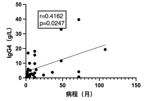 本研究组患者病程1~108个月,中位病程为10个月。血清IgG4水平在10 g/L以下时,以短病程(<10个月)为主;而血清IgG4水平超过10 g/L时,以长病程(≥10个月)为主。血清IgG4水平与病程Spearman相关性分析结果显示,患者血清IgG4水平与病程呈正相关(r =0.416 2,P =0.024 7),见表4。相关性为中等相关,提示随着病程延长,血清IgG4水平可能呈升高趋势。相关性分析的散点图见图2。