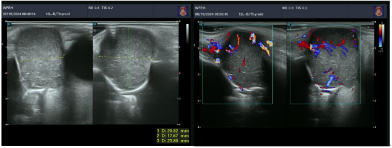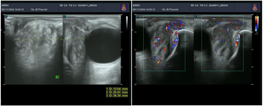 左眼泪囊显示不清,左眼眶内下方可见低回声区,大小约为2.6 cm×2.5 cm×1.3 cm,边界不清,内回声不均匀;彩色多普勒血流显像:内可见丰富血流信号。The left lacrimal sac is not clearly visualized. A hypoechoic area is seen inferiorly within the left orbit, measuring approximately 2.6 cm × 2.5 cm × 1.3 cm, with ill-defined borders and uneven internal echoes. Color Doppler flow imaging reveals abundant blood flow signals within the area.