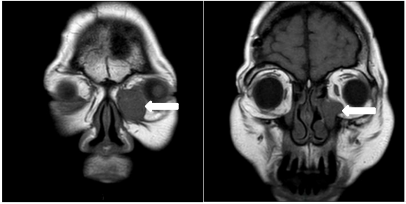 Extraconal mass in the left orbit(white arrow); Dilatation of the left bony nasolacrimal duct(blue arrow).